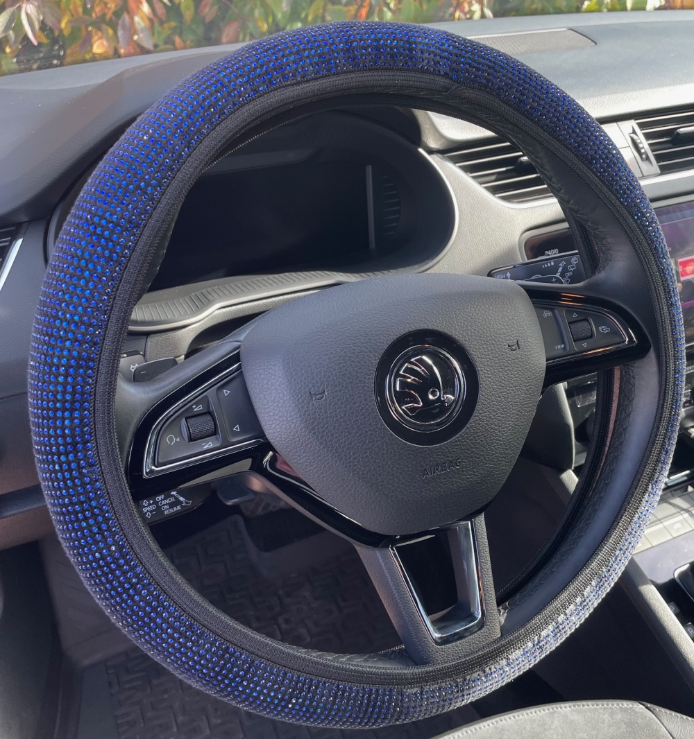 Látkový poťah určený na nasadenie na volant s priemerom 37-39cm. Príjemný do ruky. Farba kombinácia čiernej s modrými kamienkami.